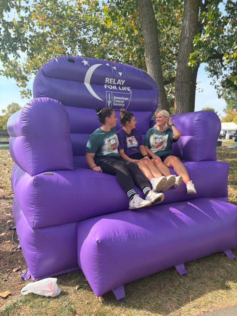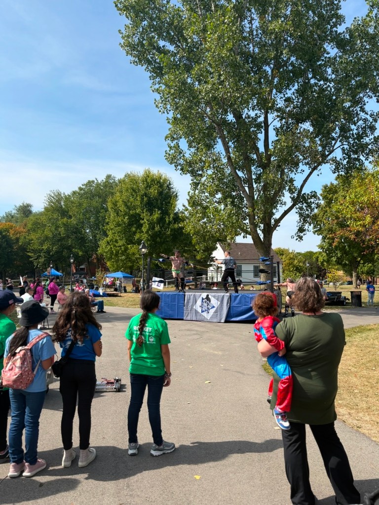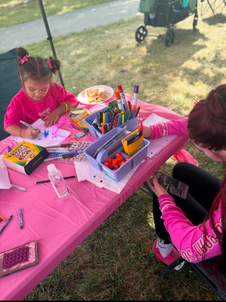 Laurie Littleton, (right) chairman of the American Cancer Society, sits on a big purple inflatable chair labeled “Relay for Life” with her two daughters, having the chair there as a photo op for people attending the Relay for Life event at Heritage Park on Sept. 20th. Photo credits: Madison GanzakTwo kids sit and color pictures at their event booth at the Relay for Life event on Sept. 20th to help raise awareness through their drawings by using crayons and markers. Photo credits: Madison Ganzak People from the Relay for Life event at Heritage Park on Sept. 20th gather around the ring to watch the wrestling match for the event called “Body Slamming Cancer.” Wrestler Jaxon Payne holds onto a rope as he signals to the audience. Photo credits: Madison GanzakA group of family and friends smile for a picture to show off their booth at the Relay for Life event at Heritage Park on Sept. 20th. Photo credits: Madison Ganzak