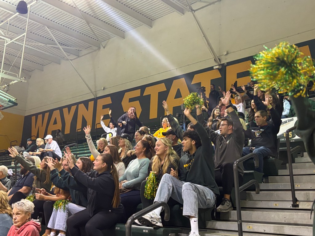 Wayne State junior Paige Giehtbrock goes for the spike as two Parkside Rangers try to block at the Wayne State vs. Parkside game on Oct. 10th. Photo credits: Madison Ganzak Wayne State volleyball players Kayla Dulgar (5) Leigha Baldwin (4) and Nicole Dupre (13) applaud for their teammates in excitement at the Wayne State vs Parkside game on Friday Oct. 10. Photo Credits: Madison GanzakWayne State Volleyball head coach Tim Koth kneels as he talks to his team during a timeout at the Wayne State vs Parkside game on Friday Oct. 10th. Photo credits: Madison GanzakWayne State volleyball fans wave their arms with excitement as t-shirts are thrown into the crowd at the Wayne State vs Parkside game on Friday Oct. 10th. Photo credits: Madison Ganzak