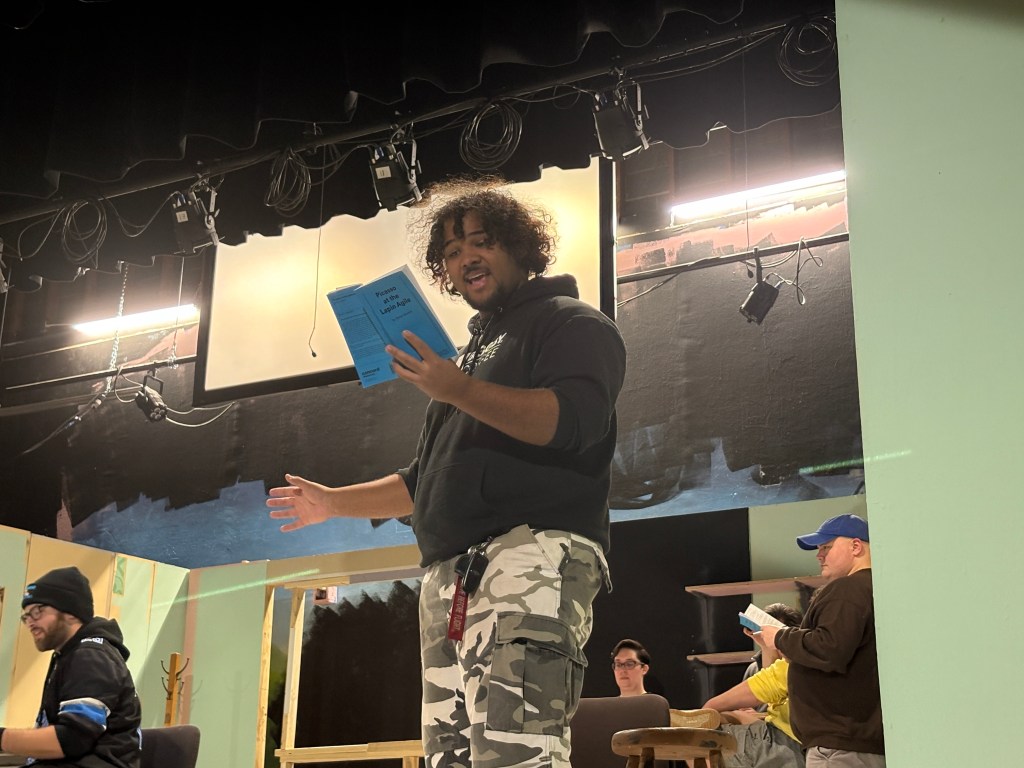 Cast members of the production of “Picasso at the Lapin Agile” raise their hands to motion glasses during a rehearsal at the Players Guild of Dearborn on Wednesday, Dec. 3rd. Photo Credits: Madison GanzakDirector of the Players Guild’s production of “Picasso at the Lapin Agile” Brian Townsend (left) gives cast member Kaleb Buonavaara-Ingram (right) blocking instructions during a rehearsal at the Players Guild of Dearborn on Wednesday, Dec. 3rd. Photo credits: Madison GanzakDirector Brian Townsend (left) gives blocking directions to cast members Kaleb Buonavaara-Ingram (middle) and Dylan Hart (right) during a rehearsal of “Picasso at the Lapin Agile” at the Players Guild of Dearborn on Wednesday, Dec. 3rd. Photo credits: Madison GanzakCast member Nathaniel Booth waves his arm out to other cast members during a rehearsal of “Picasso at the Lapin Agile” at the Players Guild of Dearborn on Wednesday, Dec. 3rd. Photo credits: Madison GanzakCast members hold their scripts and wait for blocking directions from director Brian Townsend (right) during a rehearsal of “Picasso at the Lapin Agile” at the Players Guild of Dearborn on Wednesday, Dec. 3rd. Photo credits: Madison GanzakCast member Kaleb Buonavaara-Ingram, playing the role of “Pablo Picasso,” raises his arm as he speaks his lines during a rehearsal of “Picasso at the Lapin Agile” at the Players Guild of Dearborn on Wednesday, Dec. 3rd. Photo credits: Madison Ganzak
